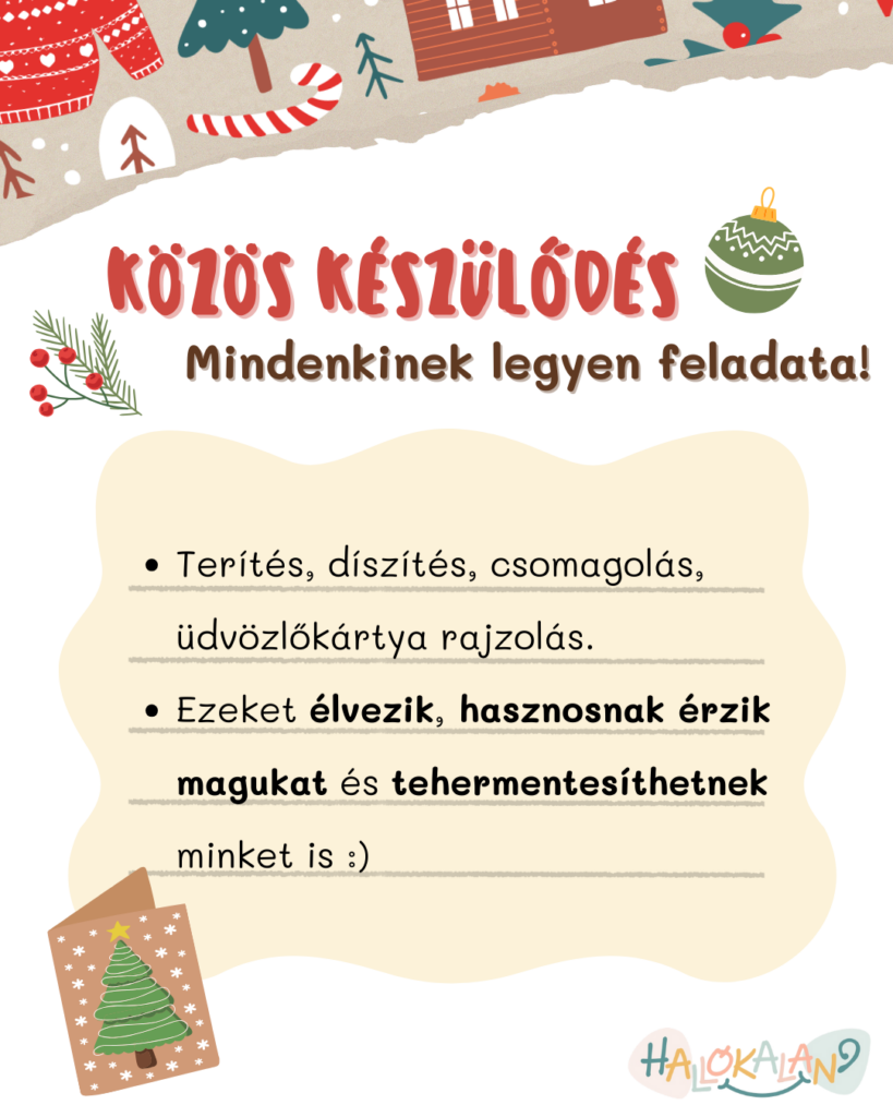 Az ünnepek körüli rengeteg teendő miatt nehéz átadni a kontrollt, pedig sok feladatot nyugodtan rábízhatunk a gyerekekre. Ők is élvezik, hasznosnak érzik magukat, és közben minket is tehermentesítenek. Megteríthetnek, díszíthetnek, csomagolhatnak, üdvözlőkártyát rajzolhatnak – az előkészületek gyakran épp olyan szórakoztatóak, mint maga az ünnep. Ráadásul ha van feladatuk, kisebb az esély, hogy a legnagyobb hajtásban még unatkozni is elkezdenek.