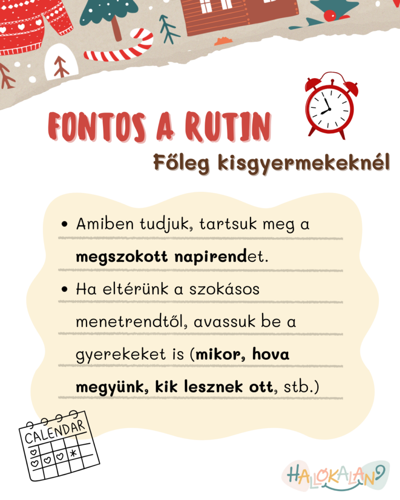 Az ünnepek segítenek kiszakadni a mindennapokból, de a sok változás könnyen stresszelheti a kisgyerekeket, akiknek fontos a rutin és a kiszámíthatóság. Amiben tudjuk, próbáljuk megtartani az állandóságot, és ha eltérünk a szokásos menetrendtől, avassuk be a gyerekeket is, tudják, hogy mire számítsanak egy adott napon a nagy ünnepi forgatagban. Hova megyünk, kik lesznek ott, meddig maradunk, vagy éppenséggel kik jönnek hozzánk? Mind-mind olyan kérdések, amiket ha előre tisztázunk, sok nehézségnek elejét tudjuk venni.