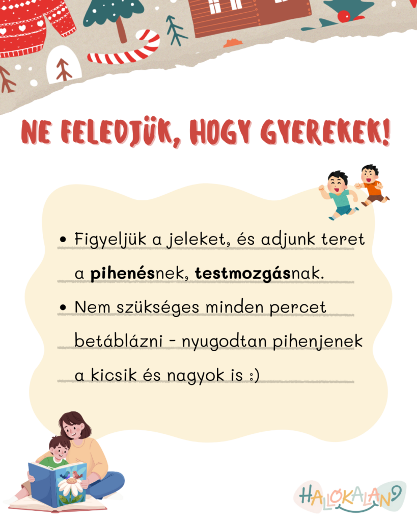 Bármennyire is szeretnénk minden programot belepréselni az ünnepbe, gondoljunk arra, hogy a gyerekek gyorsabban telítődnek élményekkel. A zsúfolt vásárok, hosszú vacsorák vagy rokonlátogatások könnyen túl sokak lehetnek nekik. Figyeljük a jeleket, és adjunk teret a pihenésnek – akár egy nyugodt délután otthon, egy kis mozgás a szabadban vagy egy közös meseolvasás formájában.