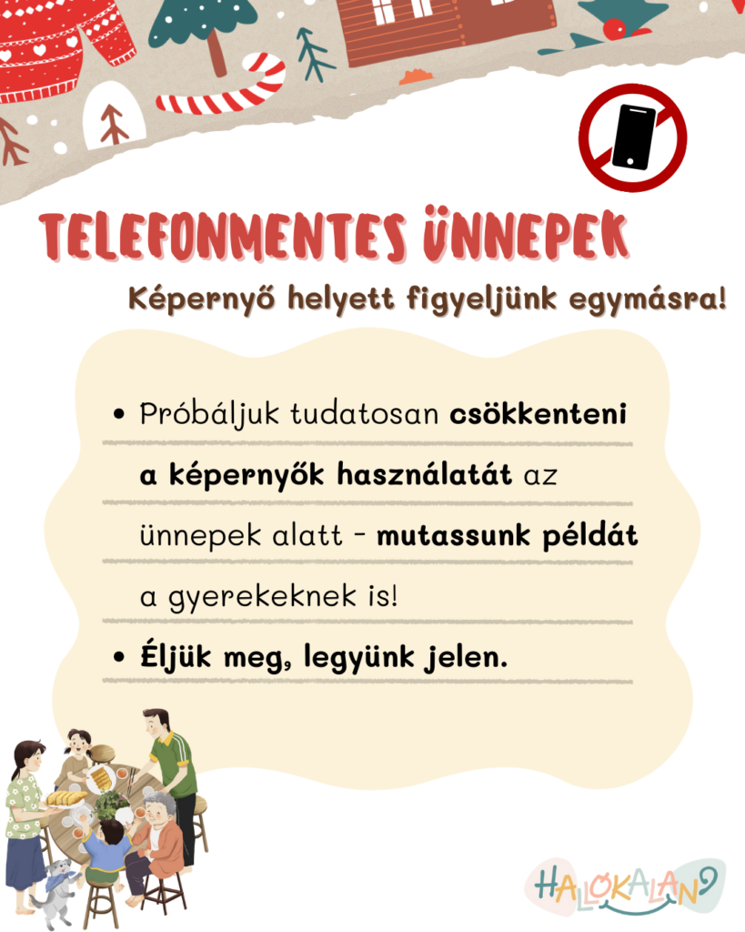 Ez az időszak szóljon a családról, az egymásra odafigyelésről. Az emlékek megörökítésén és a távoli szeretteinkkel való kapcsolattartáson kívül ne használjuk másra az eszközeinket, próbáljunk tudatosan odafigyelni, hogy mikor kerülnek elő a képernyők.